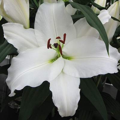 Лилия Mother's Choice (Мазез Чойс). Цветки диаметром 21 см, чашевидные, белые с желтоватой полоской с центре лепестков. В соцветиях до 5 направленных вверх цветков. Высота 110 см.