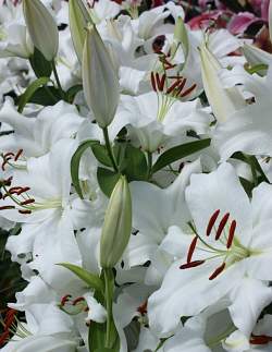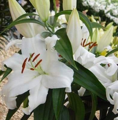 Восточные гибриды. Лилии поразительной красоты, их называют аристократами в мире лилий за экзотическую красоту необычайно привлекательных ароматных цветков. Цветки очень крупные, просто огромные, экзотических окрасок: бело-розовые, белые, малиновые, розовые с крапинками и полосками по центру волнистых лепестков или без них. Цветут в июле-сентябре. Необходимо солнечное место, хорошо защищенное от ветра, поскольку растения высокорослые с очень крупными цветками. Могут также расти в лёгкой тени деревьев. Главное правило — глубокая посадка, не менее 15 см, для защиты луковиц зимой.