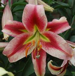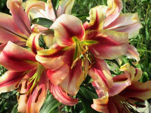 Лилия Olympic Torch (Олимпик Торч). Высота 120-180 см. Очень крупные цветки с интересной окраской: кремовые с темно-розовыми продольными мазками по центру лепестков, у основания зеленовато-желтая "звездочка", диаметр цветка 20-25 см.