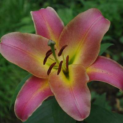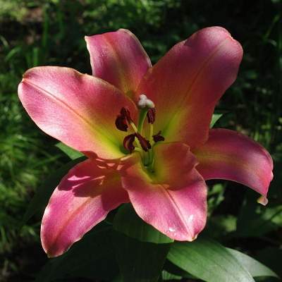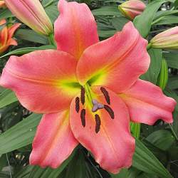 Лилия On Stage (Он Стейдж). Цветок розовый с бледно-жёлтой полосой по центру лепестка, диаметром 25 см. Высота растения 180-200 см. Настоящее "лилейное дерево".