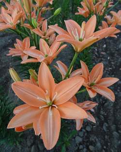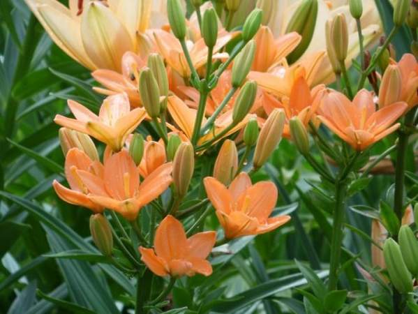 Лилии. Подходят для любого цветочного оформления участков. Низкорослые сорта и виды используют для посадок на бордюрах, высокие лилии используют для оформления дальнего плана и в солитерных посадках. Хороши они в группах, посаженные куртинами на газоне. Красиво смотрятся на фоне деревьев и кустарников и в сочетании со многими однолетниками и многолетниками. Некоторые низкорослые лилии можно применять для оформления каменистых участков.Используя при оформлении цветников лилии разного срока цветения, можно ими любоваться с июня до середины сентября.