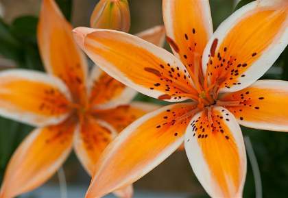 Лилия Orange Electric (Оранж Электрик). Цветы с яркой, апельсиново-рыжей окраской у горла и по центру лепестков, с широкой белой каймой по краю. Усыпаны темными крапинами. Диаметр цветка 10-15 см. Цветки направлены вверх. Высота растения 60-80 см.