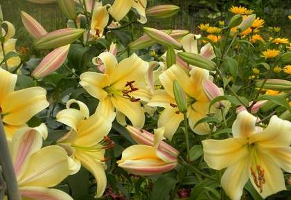 Лилии. Подходят для любого цветочного оформления участков. Низкорослые сорта и виды используют для посадок на бордюрах, высокие лилии используют для оформления дальнего плана и в солитерных посадках. Хороши они в группах, посаженные куртинами на газоне. Красиво смотрятся на фоне деревьев и кустарников и в сочетании со многими однолетниками и многолетниками. Некоторые низкорослые лилии можно применять для оформления каменистых участков.Используя при оформлении цветников лилии разного срока цветения, можно ими любоваться с июня до середины сентября.