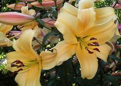 Лилия Orania (Орания). Нежные кремово-персиковые цветы (до 25 см в диаметре) с сильным запахом. Оригинальная сине-зеленая листва. Высота до 110 см.