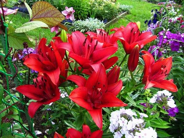 Лилии. Подходят для любого цветочного оформления участков. Низкорослые сорта и виды используют для посадок на бордюрах, высокие лилии используют для оформления дальнего плана и в солитерных посадках. Хороши они в группах, посаженные куртинами на газоне. Красиво смотрятся на фоне деревьев и кустарников и в сочетании со многими однолетниками и многолетниками. Некоторые низкорослые лилии можно применять для оформления каменистых участков.Используя при оформлении цветников лилии разного срока цветения, можно ими любоваться с июня до середины сентября.
