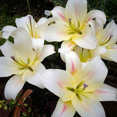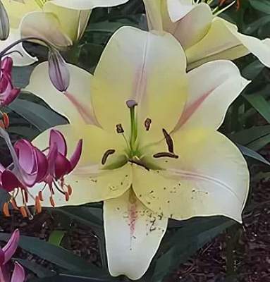 Лилия Ormea (Ормея). Цветок крупный, белый с желтоватым центром, со светло-малиновыми продольными мазками по центру лепестков и темными пыльниками, диаметр цветка до 20 см.