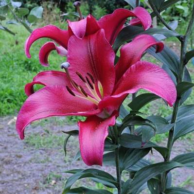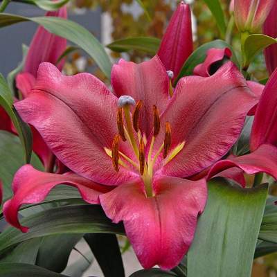 Лилия Palazzo (Палаццо). Цветок крупный, диаметром до 22 см, темно-розовый с малиновым оттенком. Высота растения 120-130 см.