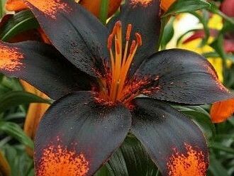 Лилия Paris Heart (Париж Харт). Цветок оранжевый с темно-фиолетовым плотным напылением в центре и по краям лепестков. Диаметр 15 см.