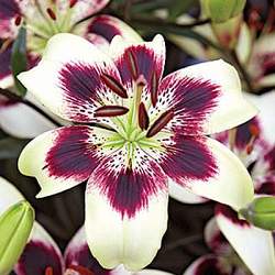 Лилия Patricia's Pride (Патрисиас Прайд). Очень декоративный сорт. Цветки сливочно-желтые, с темно-пурпурными мазками у основания лепестков. Цветки направлены вверх. Высота растения 90-100 см.
