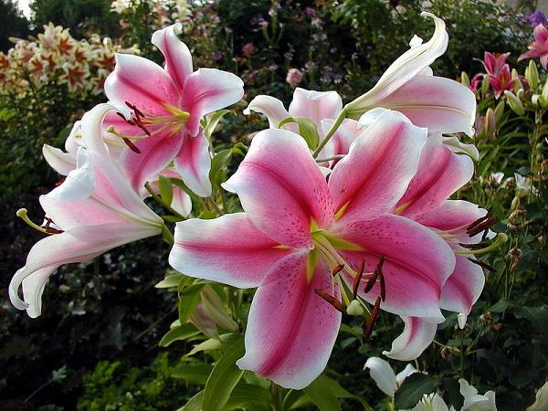 Лилии. Подходят для любого цветочного оформления участков. Низкорослые сорта и виды используют для посадок на бордюрах, высокие лилии используют для оформления дальнего плана и в солитерных посадках. Хороши они в группах, посаженные куртинами на газоне. Красиво смотрятся на фоне деревьев и кустарников и в сочетании со многими однолетниками и многолетниками. Некоторые низкорослые лилии можно применять для оформления каменистых участков.Используя при оформлении цветников лилии разного срока цветения, можно ими любоваться с июня до середины сентября.
