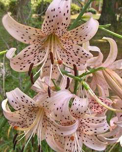 Лилия Pink Giant (Пинк Джайант). Чалмовидные кремово-розовые цветы с вишневым крапом, смотрят вниз. Триплоид. В соцветиях до 15 цветков.
