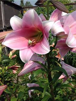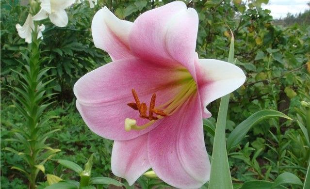 Лилия Пинк Хевен (Пинк Хевен). Взрослое растение представляет собой сформированный жесткий стебель высотой 130 см со множеством узких длинных листьев. Основной акцент уделяется крупным чашевидным цветкам с характерной нежно-розовой окраской и приятным устойчивым ароматом.
