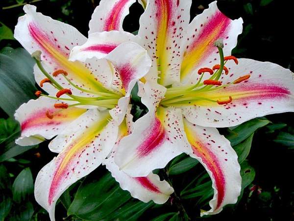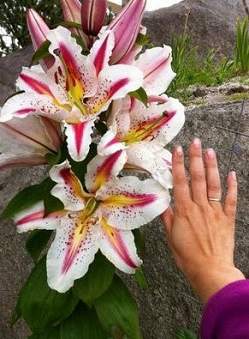Восточные гибриды. Лилии поразительной красоты, их называют аристократами в мире лилий за экзотическую красоту необычайно привлекательных ароматных цветков. Цветки очень крупные, просто огромные, экзотических окрасок: бело-розовые, белые, малиновые, розовые с крапинками и полосками по центру волнистых лепестков или без них. Цветут в июле-сентябре. Необходимо солнечное место, хорошо защищенное от ветра, поскольку растения высокорослые с очень крупными цветками. Могут также расти в лёгкой тени деревьев. Главное правило — глубокая посадка, не менее 15 см, для защиты луковиц зимой.