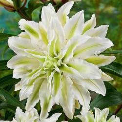 Лилия Polar Star (Полар Стар). Густомахровый цветок, напоминающий георгину, белоснежного оттенка с нежно-желтым цветом в основании лепестков. Лепестки волнистые по краю, сильно отгибаются назад. Тычинки отсутствуют.