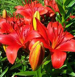 Лилии. Подходят для любого цветочного оформления участков. Низкорослые сорта и виды используют для посадок на бордюрах, высокие лилии используют для оформления дальнего плана и в солитерных посадках. Хороши они в группах, посаженные куртинами на газоне. Красиво смотрятся на фоне деревьев и кустарников и в сочетании со многими однолетниками и многолетниками. Некоторые низкорослые лилии можно применять для оформления каменистых участков.Используя при оформлении цветников лилии разного срока цветения, можно ими любоваться с июня до середины сентября.