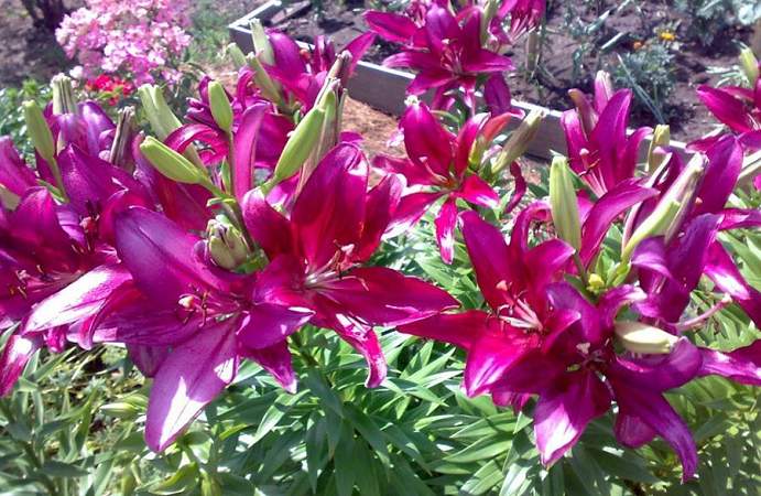 Лилии. Подходят для любого цветочного оформления участков. Низкорослые сорта и виды используют для посадок на бордюрах, высокие лилии используют для оформления дальнего плана и в солитерных посадках. Хороши они в группах, посаженные куртинами на газоне. Красиво смотрятся на фоне деревьев и кустарников и в сочетании со многими однолетниками и многолетниками. Некоторые низкорослые лилии можно применять для оформления каменистых участков.Используя при оформлении цветников лилии разного срока цветения, можно ими любоваться с июня до середины сентября.