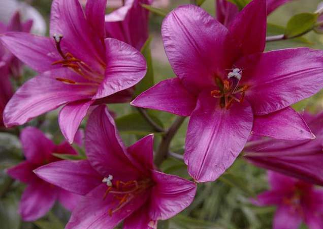 Лилии. Подходят для любого цветочного оформления участков. Низкорослые сорта и виды используют для посадок на бордюрах, высокие лилии используют для оформления дальнего плана и в солитерных посадках. Хороши они в группах, посаженные куртинами на газоне. Красиво смотрятся на фоне деревьев и кустарников и в сочетании со многими однолетниками и многолетниками. Некоторые низкорослые лилии можно применять для оформления каменистых участков.Используя при оформлении цветников лилии разного срока цветения, можно ими любоваться с июня до середины сентября.