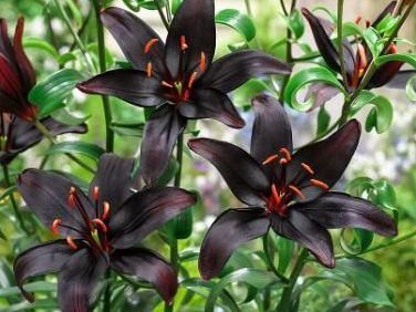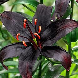 Лилия Queen of the Night (Куин ов Найт). Крупные цветы диаметром 17 см, тёмно-бордовые, почти черные, атласные, тычинки оранжевые. Высота взрослого растения до 100 см.