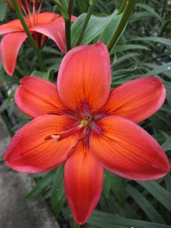 Лилия Red Electric (Ред Электрик). Цветки в центре ало-оранжевые, к краям лепестков насыщенно-алые с розовой каймой. Усыпаны темными крапинами. Диаметр цветка 10-15 см. Цветки направлены вверх. Высота растения 60-80 см. Необычный сорт.