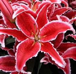 Восточные гибриды. Лилии поразительной красоты, их называют аристократами в мире лилий за экзотическую красоту необычайно привлекательных ароматных цветков. Цветки очень крупные, просто огромные, экзотических окрасок: бело-розовые, белые, малиновые, розовые с крапинками и полосками по центру волнистых лепестков или без них. Цветут в июле-сентябре. Необходимо солнечное место, хорошо защищенное от ветра, поскольку растения высокорослые с очень крупными цветками. Могут также расти в лёгкой тени деревьев. Главное правило — глубокая посадка, не менее 15 см, для защиты луковиц зимой.