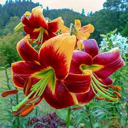 Лилии. Подходят для любого цветочного оформления участков. Низкорослые сорта и виды используют для посадок на бордюрах, высокие лилии используют для оформления дальнего плана и в солитерных посадках. Хороши они в группах, посаженные куртинами на газоне. Красиво смотрятся на фоне деревьев и кустарников и в сочетании со многими однолетниками и многолетниками. Некоторые низкорослые лилии можно применять для оформления каменистых участков.Используя при оформлении цветников лилии разного срока цветения, можно ими любоваться с июня до середины сентября.