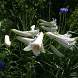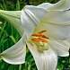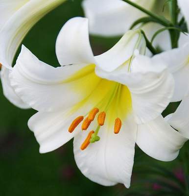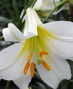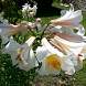 Лилия Regale Album (Королевская, Регале Альбум). Цветок белый с жёлтым центром, тычинки желтые. Высота около 130 см.
