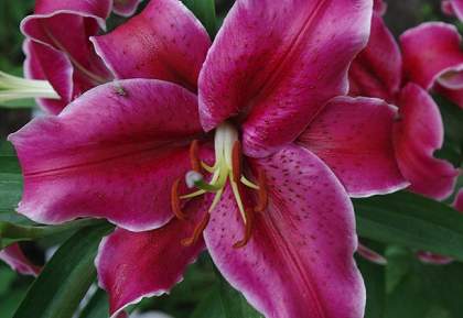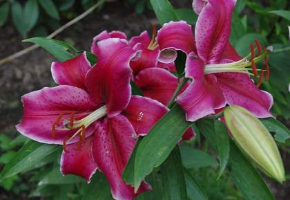 Восточные гибриды. Лилии поразительной красоты, их называют аристократами в мире лилий за экзотическую красоту необычайно привлекательных ароматных цветков. Цветки очень крупные, просто огромные, экзотических окрасок: бело-розовые, белые, малиновые, розовые с крапинками и полосками по центру волнистых лепестков или без них. Цветут в июле-сентябре. Необходимо солнечное место, хорошо защищенное от ветра, поскольку растения высокорослые с очень крупными цветками. Могут также расти в лёгкой тени деревьев. Главное правило — глубокая посадка, не менее 15 см, для защиты луковиц зимой.