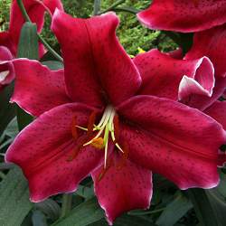Лилия Rio Negro (Рио Негро). Цветок красный, с крапом, лепестки волнистые, по краю светлее, диаметр 18 см.