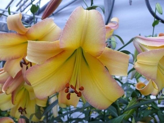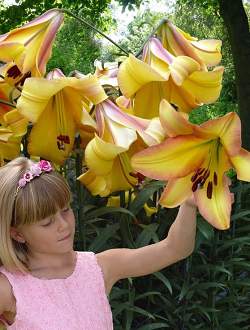 Лилия Rising Moon (Райзинг Мун). Цветки достигают 22 см в диаметре, направлены в стороны. Основания лепестков плотно сомкнуты и образуют трубку. Цвет желтый с палево-розовой каймой и темными пыльниками.