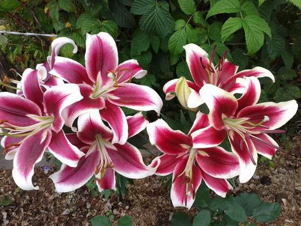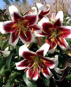 Лилия Robert Griesbach (Роберт Грисбах). Диаметр цветка 20-25 см. Цветки чашевидной формы с закрученными лепестками, вишнево-красного или винно-красного цвета с зеленоватым горлом и широкой белой каймой. При ярком солнце и жарким летом цветки могут быть в малиново-розовой окраске. Высота до 180 см. На цветоносе до 20 цветков.