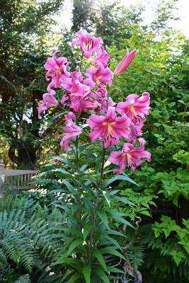 Лилия Robina (Робина). Великолепная лилия. Цвет холодный насыщенный розовый, с перламутровым блеском. Бутоны раскрываются в огромные цветки более 20 см в диаметре. На одном цветоносе множество цветков. Смотрится роскошно.