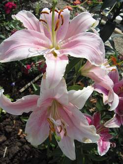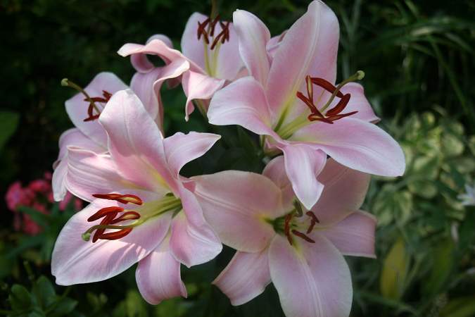 Лилии. Подходят для любого цветочного оформления участков. Низкорослые сорта и виды используют для посадок на бордюрах, высокие лилии используют для оформления дальнего плана и в солитерных посадках. Хороши они в группах, посаженные куртинами на газоне. Красиво смотрятся на фоне деревьев и кустарников и в сочетании со многими однолетниками и многолетниками. Некоторые низкорослые лилии можно применять для оформления каменистых участков.Используя при оформлении цветников лилии разного срока цветения, можно ими любоваться с июня до середины сентября.