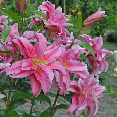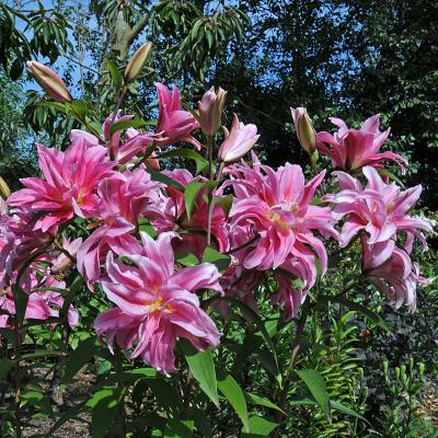 Восточные гибриды. Лилии поразительной красоты, их называют аристократами в мире лилий за экзотическую красоту необычайно привлекательных ароматных цветков. Цветки очень крупные, просто огромные, экзотических окрасок: бело-розовые, белые, малиновые, розовые с крапинками и полосками по центру волнистых лепестков или без них. Цветут в июле-сентябре. Необходимо солнечное место, хорошо защищенное от ветра, поскольку растения высокорослые с очень крупными цветками. Могут также расти в лёгкой тени деревьев. Главное правило — глубокая посадка, не менее 15 см, для защиты луковиц зимой.