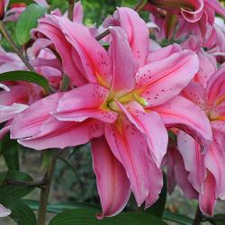 Лилия Roselily Felicia (Роузлили Фелиция). Цветки махровые крупные, диаметром 20 см, розовые, с жемчужно-белыми переливами, яркой лососево-розовой полосой, и крапом, без пыльцы, растущие вверх. Лилия зацветает в конце июля-начале августа, имеет насыщенный аромат. Высота растения 100 см.