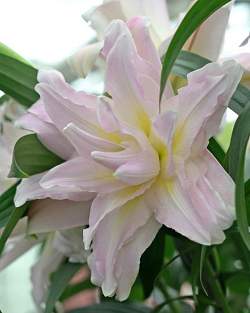 Лилия Roselily Roberta (Роузлили Роберта). Восточный гибрид. Цветы махровые, до 20 см в диаметре, нежно-розовые с жемчужно-белыми переливами и желтыми полосами. Без пыльцы. Цветки направлены вверх и в стороны. Зацветают в конце июля-начале августа, имеют насыщенный аромат. Высота растения 100 см.
