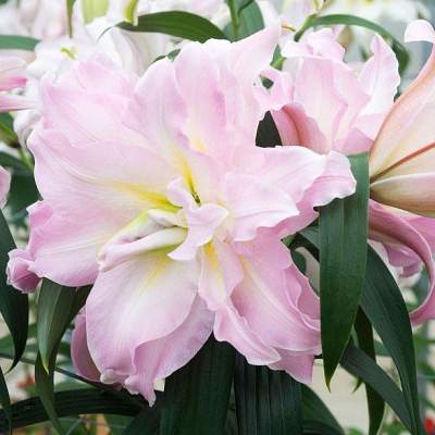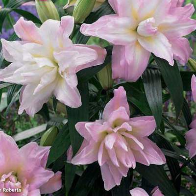 Лилия Roselily Roberta (Роузлили Роберта). Восточный гибрид. Цветы махровые, до 20 см в диаметре, нежно-розовые с жемчужно-белыми переливами и желтыми полосами. Без пыльцы. Цветки направлены вверх и в стороны. Зацветают в конце июля-начале августа, имеют насыщенный аромат. Высота растения 100 см.