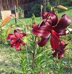 Лилии. Подходят для любого цветочного оформления участков. Низкорослые сорта и виды используют для посадок на бордюрах, высокие лилии используют для оформления дальнего плана и в солитерных посадках. Хороши они в группах, посаженные куртинами на газоне. Красиво смотрятся на фоне деревьев и кустарников и в сочетании со многими однолетниками и многолетниками. Некоторые низкорослые лилии можно применять для оформления каменистых участков.Используя при оформлении цветников лилии разного срока цветения, можно ими любоваться с июня до середины сентября.