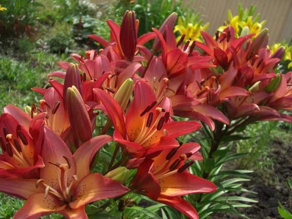 Лилии. Подходят для любого цветочного оформления участков. Низкорослые сорта и виды используют для посадок на бордюрах, высокие лилии используют для оформления дальнего плана и в солитерных посадках. Хороши они в группах, посаженные куртинами на газоне. Красиво смотрятся на фоне деревьев и кустарников и в сочетании со многими однолетниками и многолетниками. Некоторые низкорослые лилии можно применять для оформления каменистых участков.Используя при оформлении цветников лилии разного срока цветения, можно ими любоваться с июня до середины сентября.