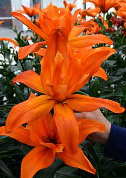 Лилия Scoubidou (Скубиду). Крупный (15 см) темно-оранжевый цветок. Лепестки не очень широкие, благодаря чему цветок смотрится изящно. Высота около 110 см.