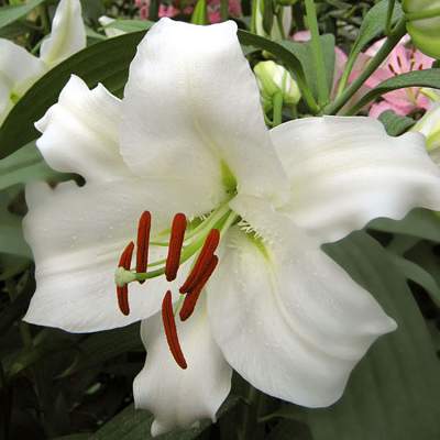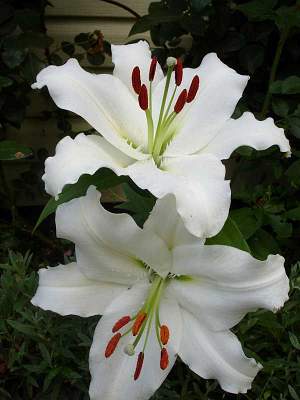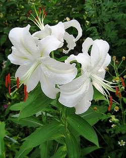 Восточные гибриды. Лилии поразительной красоты, их называют аристократами в мире лилий за экзотическую красоту необычайно привлекательных ароматных цветков. Цветки очень крупные, просто огромные, экзотических окрасок: бело-розовые, белые, малиновые, розовые с крапинками и полосками по центру волнистых лепестков или без них. Цветут в июле-сентябре. Необходимо солнечное место, хорошо защищенное от ветра, поскольку растения высокорослые с очень крупными цветками. Могут также расти в лёгкой тени деревьев. Главное правило — глубокая посадка, не менее 15 см, для защиты луковиц зимой.