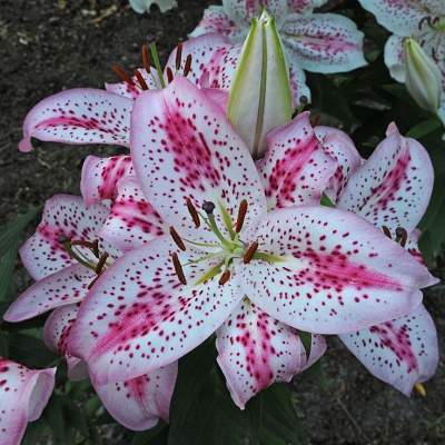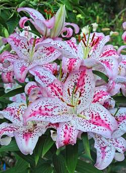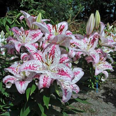 Восточные гибриды. Лилии поразительной красоты, их называют аристократами в мире лилий за экзотическую красоту необычайно привлекательных ароматных цветков. Цветки очень крупные, просто огромные, экзотических окрасок: бело-розовые, белые, малиновые, розовые с крапинками и полосками по центру волнистых лепестков или без них. Цветут в июле-сентябре.