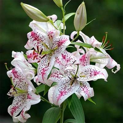 Лилия Solution (Солюшн). Потрясающе нарядная и изысканная лилия! Цветок крупный, белый с легким розовым кантом, малиновыми мазками от середины лепестка к кончикам и темно-розовым крапом. Диаметр 22 см. Высота 80 см.