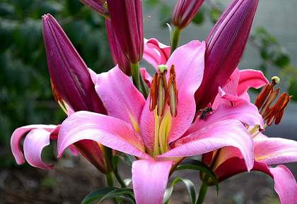 Лилия Space Mountain (Спейс Маунтин). Цветки диаметром 23 см, пурпурно-красные, у основания зеленоватые, края слегка волнистые. Цветки направлены в сторону и вверх. Бутоны пурпурно-малиновые, очень красиво сочетаются с распустившимися цветами. Зацветает в июле-августе. Имеет сильный аромат. Высота растения 100 см.