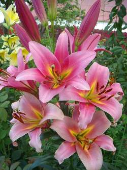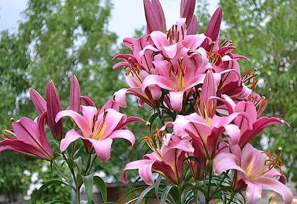 Лилии. Подходят для любого цветочного оформления участков. Низкорослые сорта и виды используют для посадок на бордюрах, высокие лилии используют для оформления дальнего плана и в солитерных посадках. Хороши они в группах, посаженные куртинами на газоне. Красиво смотрятся на фоне деревьев и кустарников и в сочетании со многими однолетниками и многолетниками. Некоторые низкорослые лилии можно применять для оформления каменистых участков. Используя при оформлении цветников лилии разного срока цветения, можно ими любоваться с июня до середины сентября.