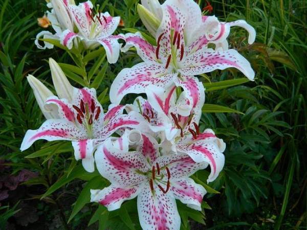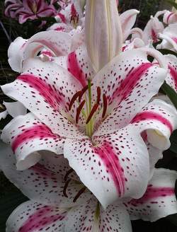 Восточные гибриды. Лилии поразительной красоты, их называют аристократами в мире лилий за экзотическую красоту необычайно привлекательных ароматных цветков. Цветки очень крупные, просто огромные, экзотических окрасок: бело-розовые, белые, малиновые, розовые с крапинками и полосками по центру волнистых лепестков или без них. Цветут в июле-сентябре. Необходимо солнечное место, хорошо защищенное от ветра, поскольку растения высокорослые с очень крупными цветками. Могут также расти в лёгкой тени деревьев. Главное правило — глубокая посадка, не менее 15 см, для защиты луковиц зимой.