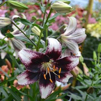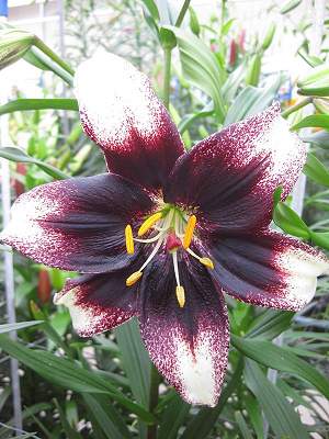 Лилия Stracciatella Event (Страчьятелла Ивент). Цветок белый с темно-пурпурным центром и густым крапом вдоль лепестков. Высота 110 см. Новинка.