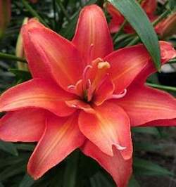 Лилия Strawberry Vanilla (Стробери Ванилла). Цветки крупные, диаметром 17 см, красновато-оранжевые с жёлтым отливом в центре. Высота растения 60 см.