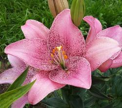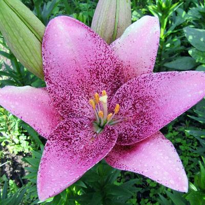 Лилия Sweet Sugar (Свит Шугар). Крупный цветок, нежно-розовый с сиреневым оттенком и густым темно-розовым крапом, диаметр цветка 20-23 см.