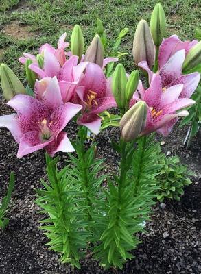 Лилии. Подходят для любого цветочного оформления участков. Низкорослые сорта и виды используют для посадок на бордюрах, высокие лилии используют для оформления дальнего плана и в солитерных посадках. Хороши они в группах, посаженные куртинами на газоне. Красиво смотрятся на фоне деревьев и кустарников и в сочетании со многими однолетниками и многолетниками. Некоторые низкорослые лилии можно применять для оформления каменистых участков.Используя при оформлении цветников лилии разного срока цветения, можно ими любоваться с июня до середины сентября.