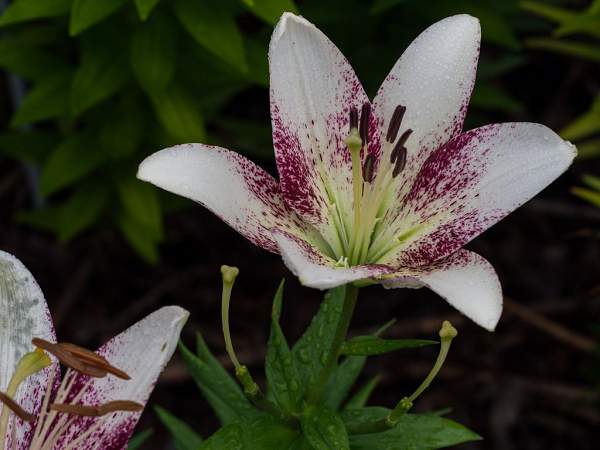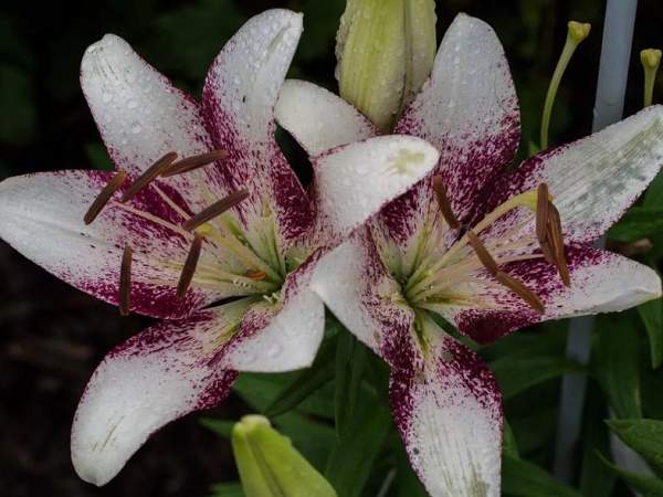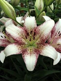Лилия Sweet Zanica (Свит Дзаника). Растение высотой до 120 см. Цветки крупные, белые с густым бордовым крапом у центра и по краям лепестков, диаметром 18-22 см. Тонкий нежный аромат. Период цветения июнь-июль.